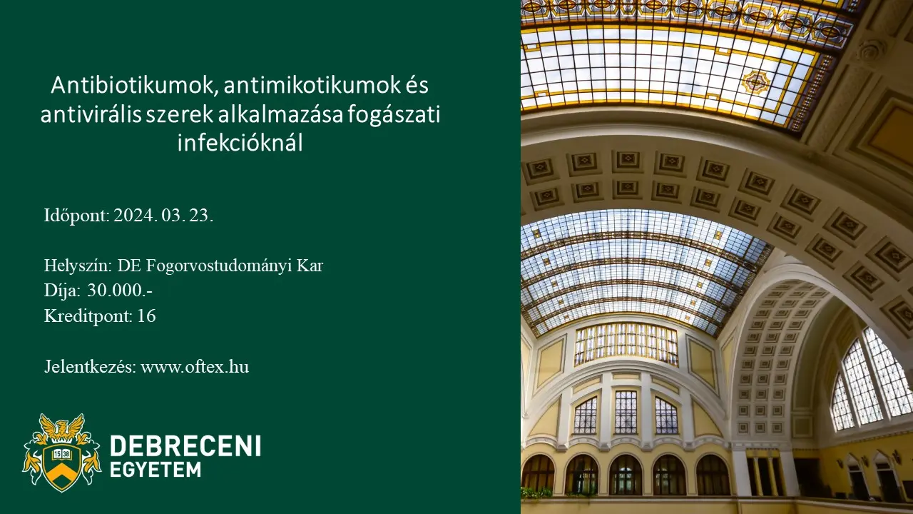 2024. 03. 23., szo – 09:00 - 2024. 03. 23., szo – 17:00 Antibiotikumok, antimikotikumok és antivirális szerek alkalmazása fogászati infekcióknál. Jelentkezés: www.oftex.hu Legutóbbi frissítés: 2024. 01. 25. 12:37